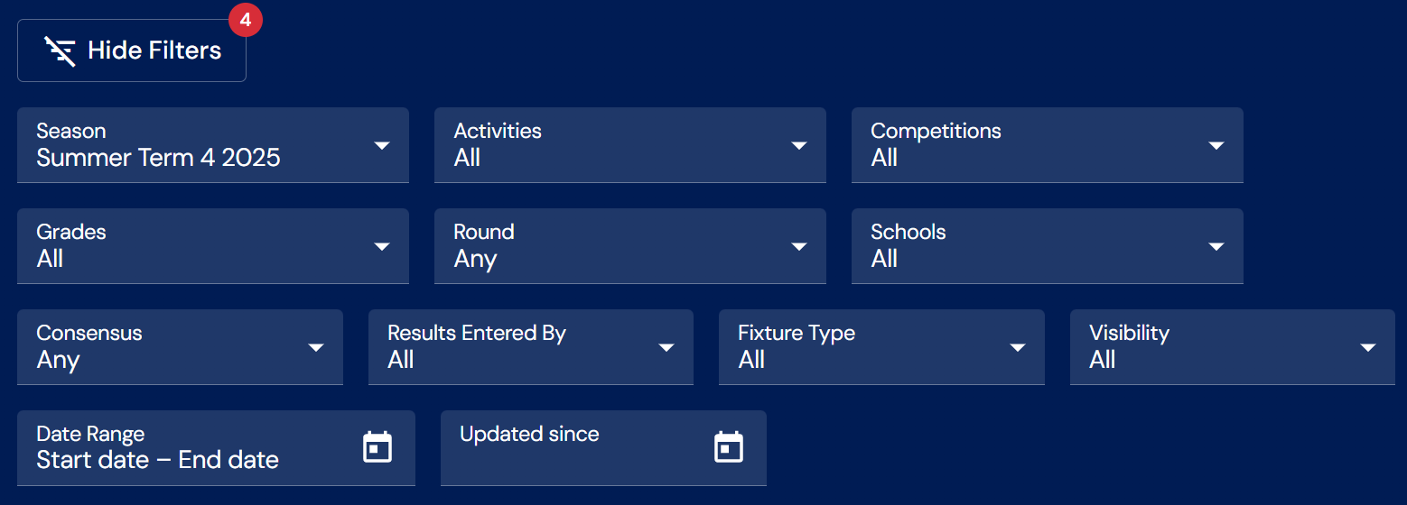 CLIPBOARD INSTRUCTIONS: Click the ‘Show Filters’ button to view specific fixtures for particular sports, competitions, grades, or schools. Select your desired Activity/Sport, Competition, and Grade. If needed, you can also filter by School, Date Range, and Round to further customise the fixtures displayed.